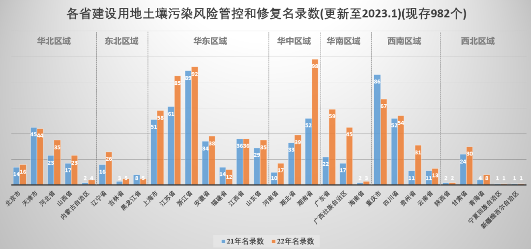 随着全国土壤污染状况详查工作的推进,各省市陆续更新了污染地块修复名录,2022年全国污染地块总数达到982块,较2021年增长了27.5%。数据显示,全国建设用地土壤污染风险管控名录中的地块数量处在快速增长阶段,“十四五”期间行业发展空间较大。
